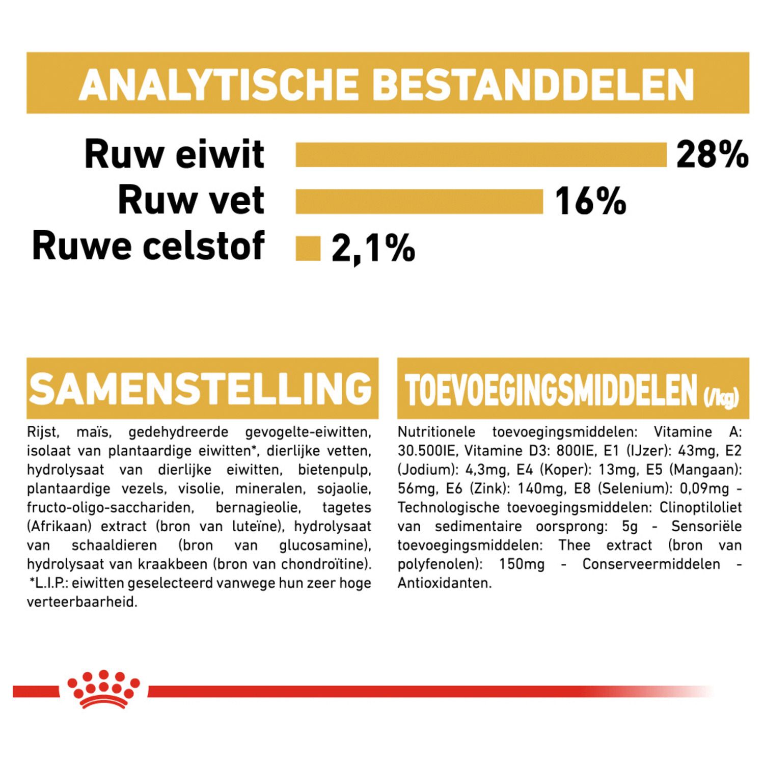 Samenstelling: rijst, maïs, gedehydreerde gevogelte-eiwitten, isolaat van plantaardige eiwitten*, dierlijke vetten, hydrolysaat van dierlijke eiwitten, bietenpulp, plantaardige vezels, visolie, mineralen, sojaolie, fructo-oligosacchariden, bernagieolie, tagetes (Afrikaan) extract (bron van luteïne), hydrolysaat van schaaldieren (bron van glucosamine), hydrolysaat van kraakbeen (bron van chondroïtine).