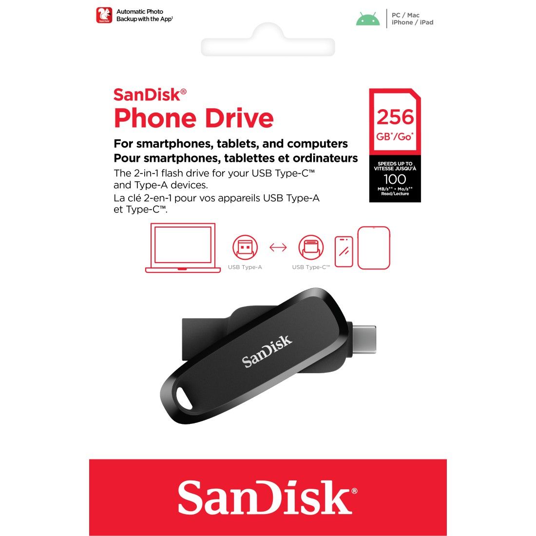 SanDisk Phone Drive 256 GB USB-C 3,2 / USB-A 100mb/s Zwart