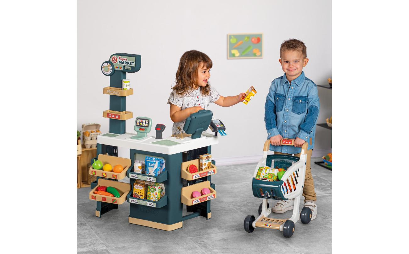 Een interactieve supermarkt met een elektronische kassa en een karretje, gemaakt voor echte winkelliefhebbers.