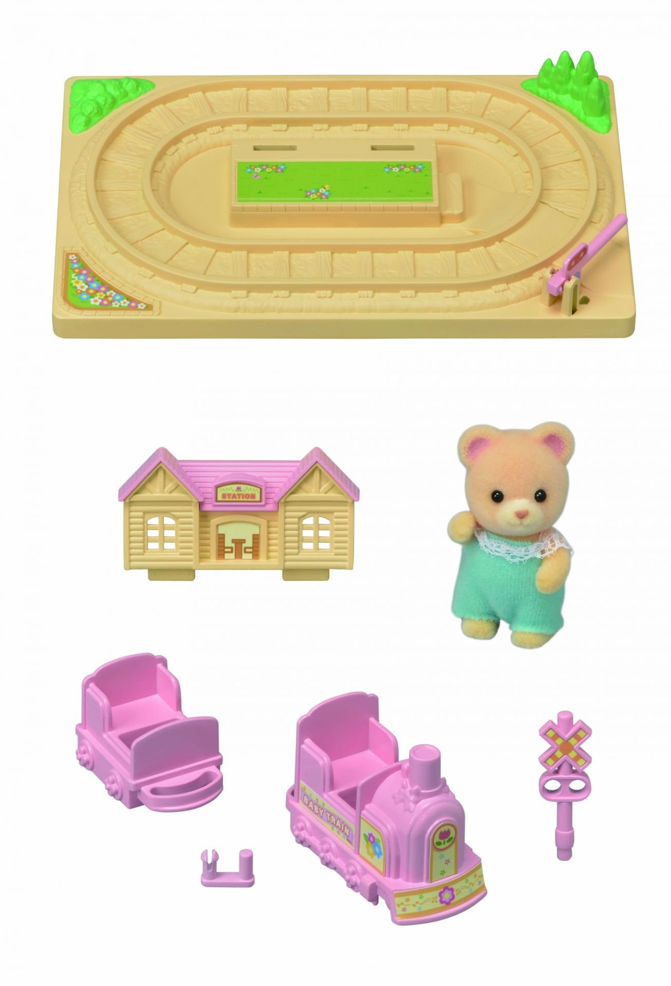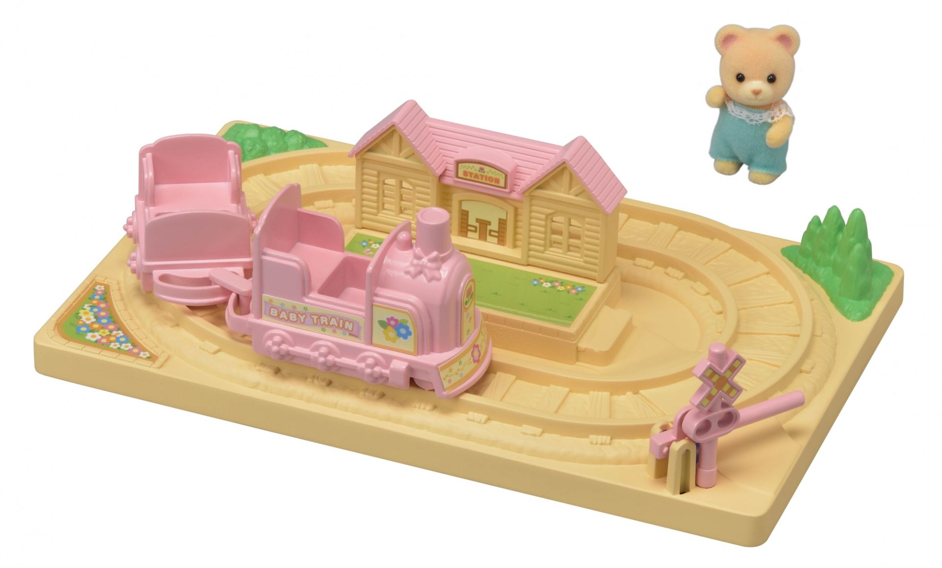 De baby choo-choo trein komt als een set met één baby beerfiguur (extra figuren niet inbegrepen). Deze speelset is meteen klaar voor kinderen om mee te spelen als een product op zichzelf. De twee treinstellen kunnen met de hand over het spoor worden geduwd. Er past één babyfiguur in elk treinstel. Er is ook een spoorwegovergang met een beweegbaar hek.