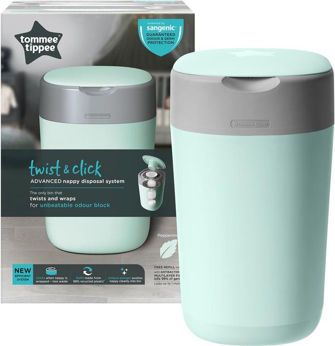 - Nu nog milieuvriendelijker***: De Twist & Click-luieremmers en het navulchassis zijn gemaakt van 98% gerecycled en volledig recyclebaar plastic en bevatten nu het antibacteriële GREENFILM™, die is gemaakt van duurzaam geteeld suikerriet