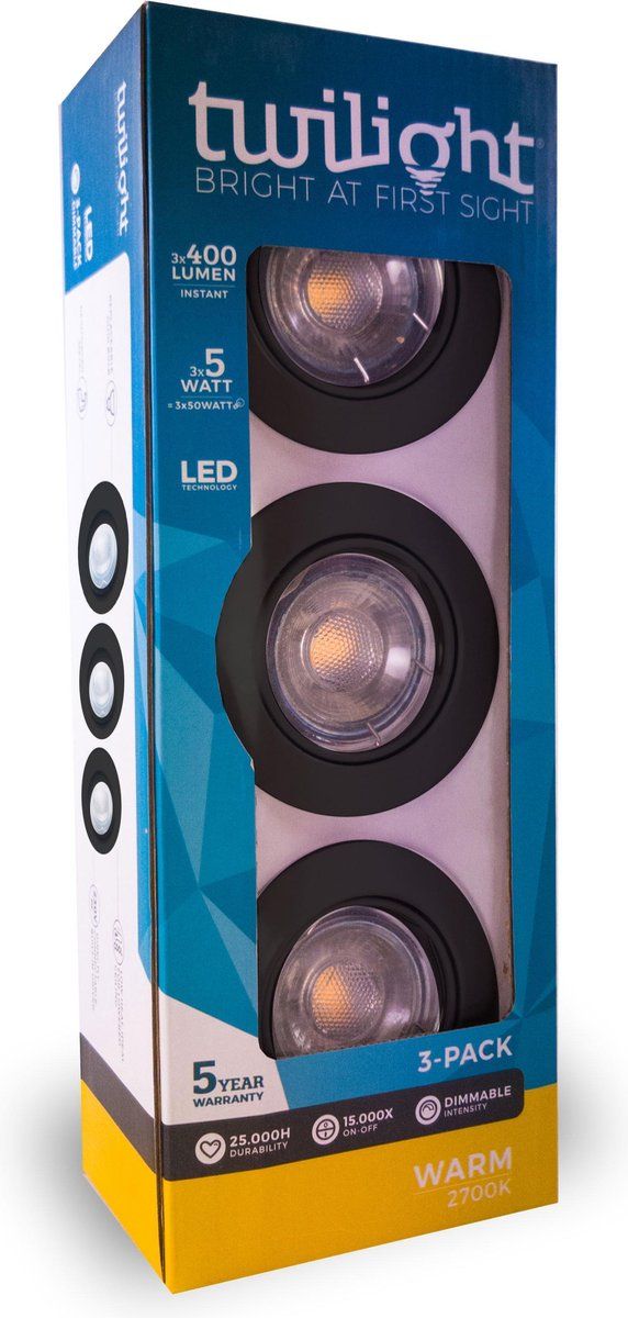 Twilight Inbouwspot GU10 3-pack Zwart 3x 5W 400 Lumen Dimbare Lamp Inbegrepen