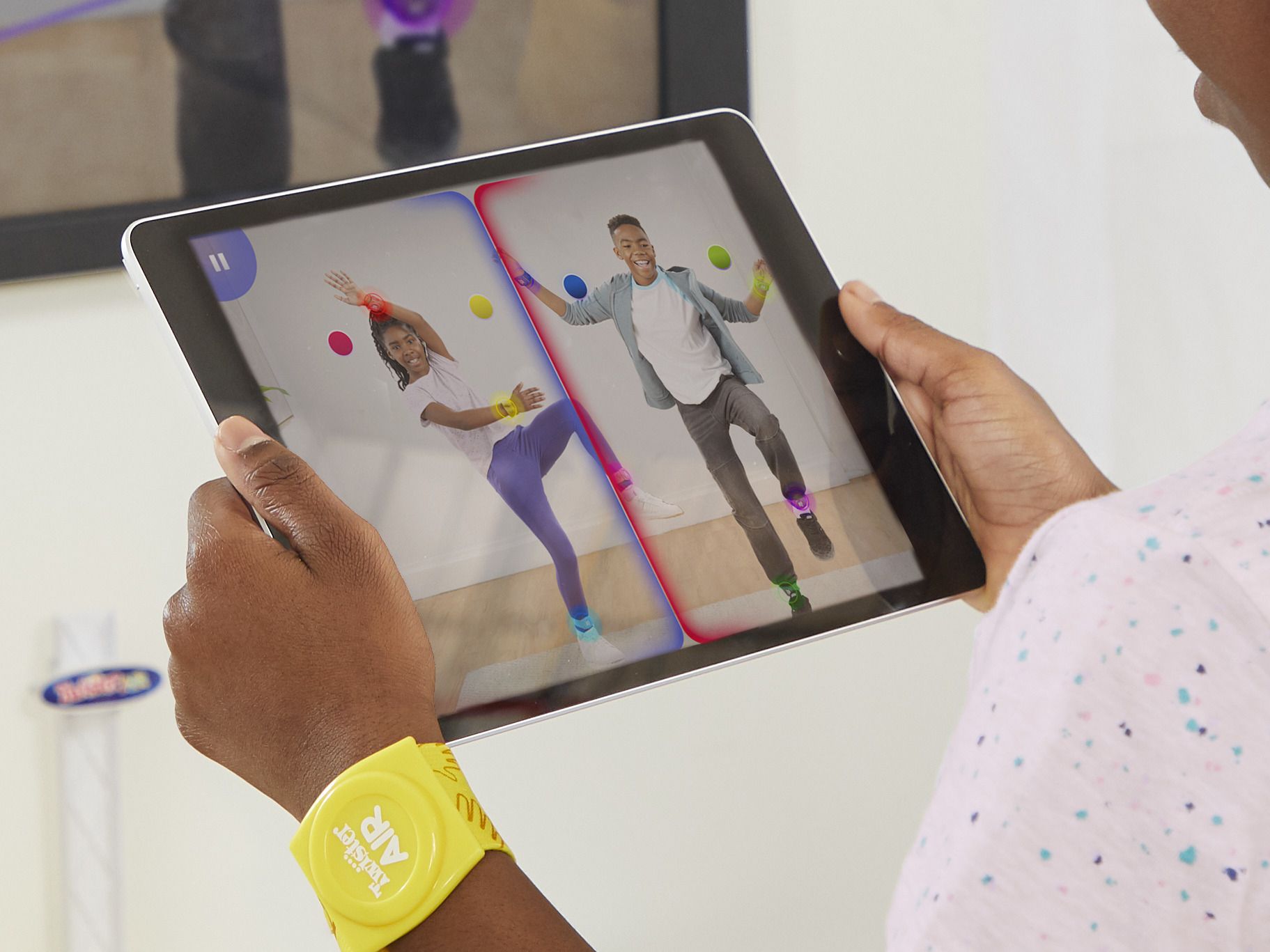 - 8 KLEURRIJKE BANDEN EN APPARAATSTANDAARD: inclusief 2 sets met 4 one-size-fits-all Twister Air-stretchbanden voor polsen en enkels, plus een verstelbare standaard voor het slimme apparaat dat nodig is voor het spel