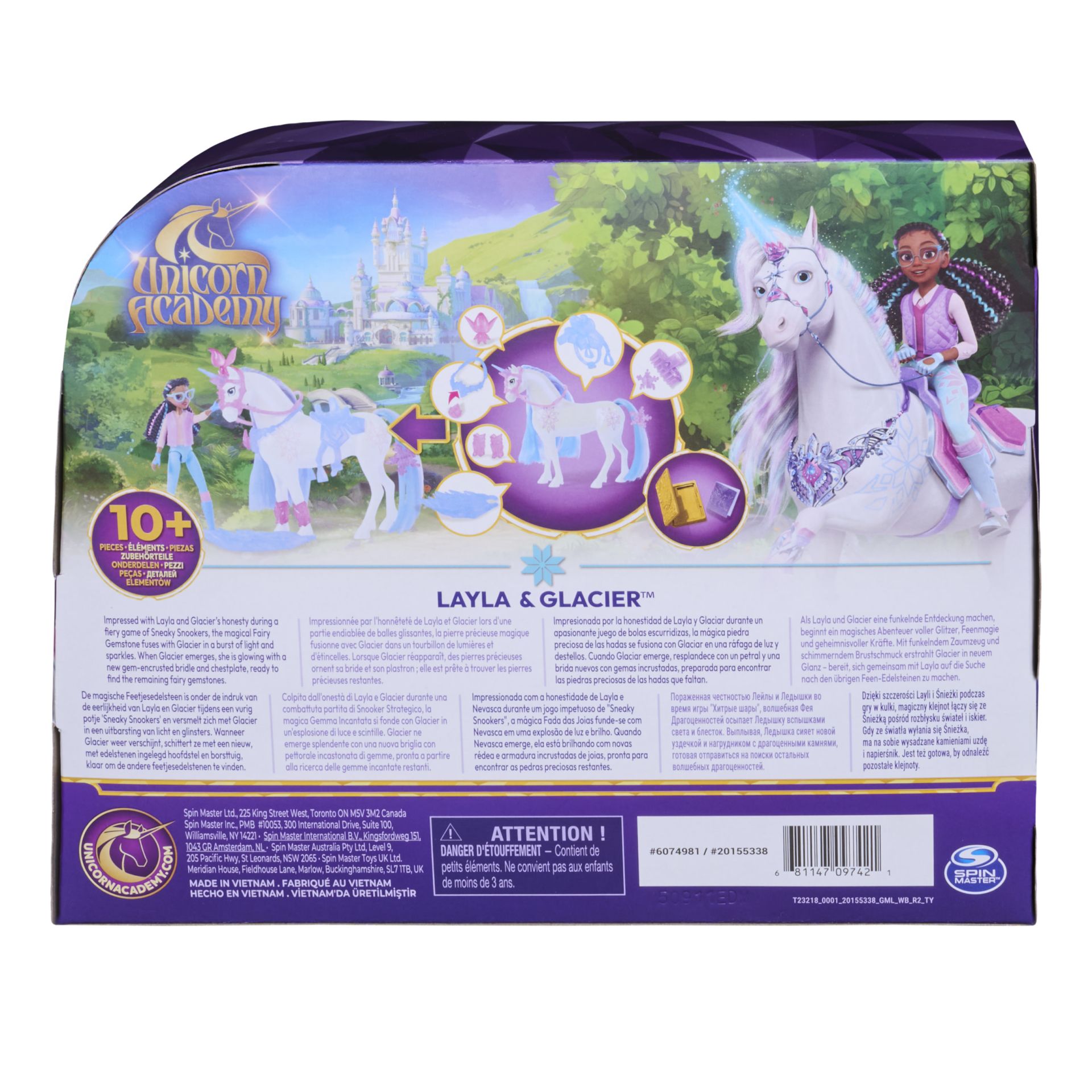 Ervaar de magie van de Unicorn Academy met Glacier's Gemstone Adventure. Deze set is geïnspireerd op de Netflix-animatieserie en de populaire boekenreeks waarin alles draait om vriendschap. Je kunt eindeloos fantastische verhalen blijven vertellen met de unieke Layla-pop en Glacier plus 13 poppenaccessoires. Glacier's Gemstone Adventure biedt alles wat je nodig hebt om de feetjesedelstenen te vinden. Layla is 11,4 cm groot, heeft een paardenstaart en kan op 7 punten bewegen voor allerlei poses. Glacier is 12,7 cm groot en heeft een met edelstenen ingelegd tuig. Ze heeft ook schitterende manen en een sprankelende staart. Plaats Layla tijdens het spelen op Glacier en rijd het avontuur tegemoet. Layla blijft stevig op Glacier zitten dankzij het afneembare hoofdstel en zadel als ze naar de edelstenen zoeken. Je spel wordt nog leuker dankzij accessoires als het openslaande Sprankelboek, een landkaart, beenbeschermers voor Glacier, een lotfeetje en nog veel meer. En kun je maar geen genoeg krijgen van de Unicorn Academy en je favoriete personages, dan breid je je wereld uit met de modepoppen, eenhoorns en sets van kleine poppen en eenhoorns (elk afzonderlijk verkocht). Voor kinderen die genieten van eenhoorn- en paardenspeelgoed, poppen en accessoires, spelen met poppenhuizen, verzamelobjecten, pluchen speelgoed en meer, is Unicorn Academy-speelgoed een leuk cadeau voor meisjes voor een verjaardag of andere gelegenheid. Haal nu de Unicorn Academy Glacier’s Gemstone Adventure-set in huis.
