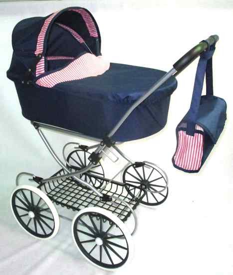 Vintage Poppenwagen met luiertas donkerblauw, voor poppen 35-46 cm