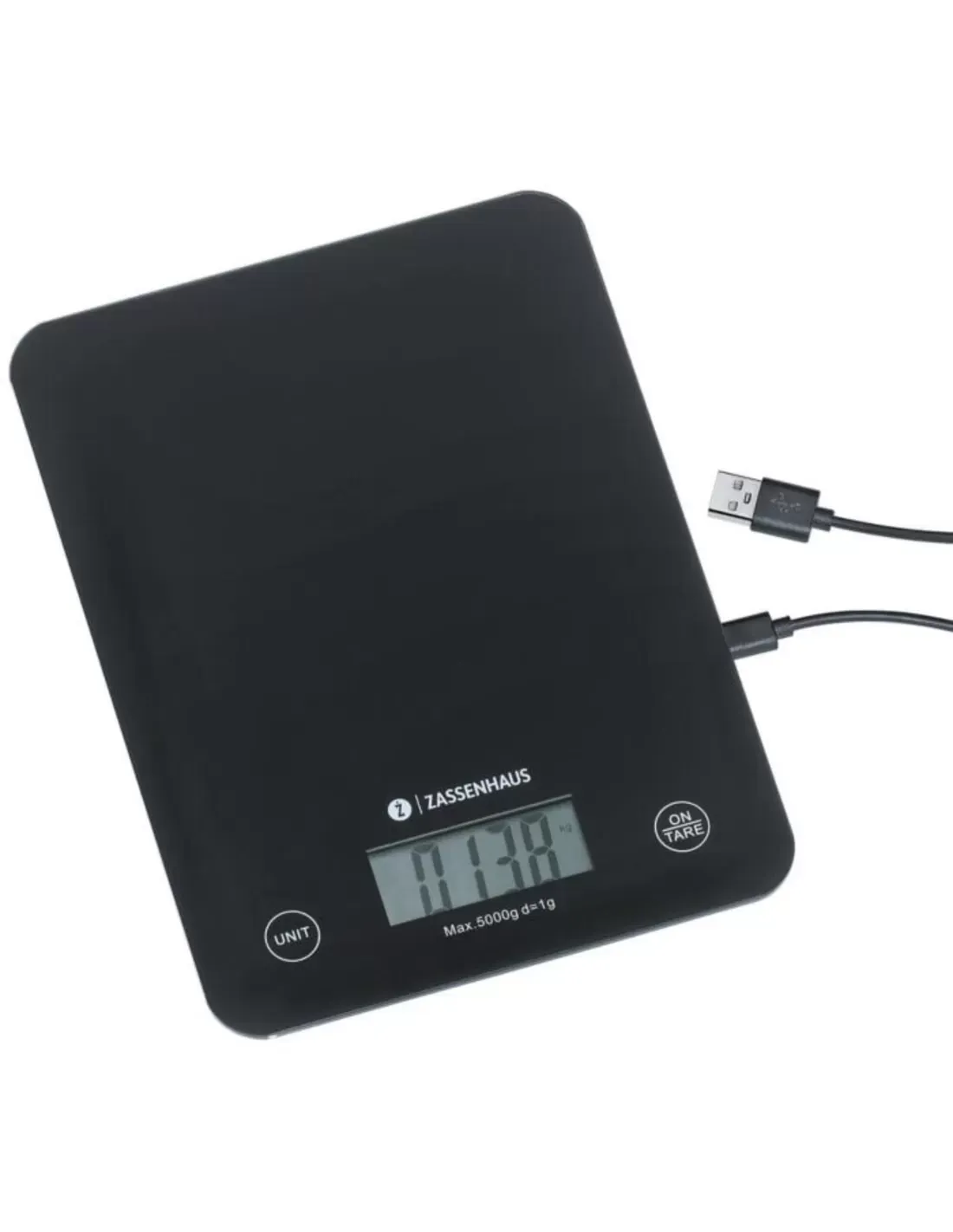 Zassenhaus Keukenweegschaal Balance - Digitaal - tot 5kg - op 1g - LC-Display - 21.5x16x2 cm - Breukvast Glas - met USB
